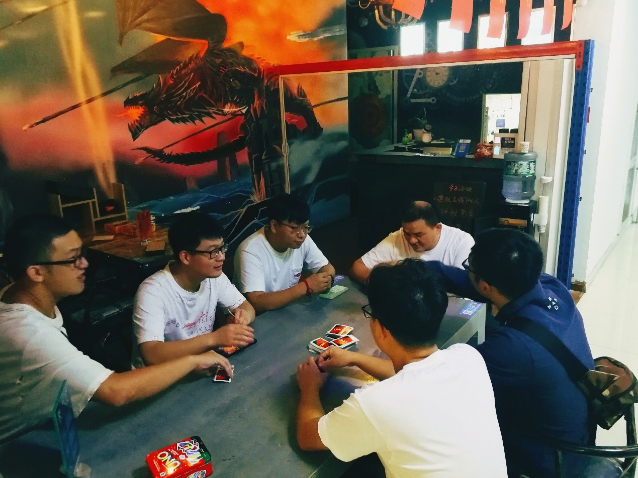 時至秋分已過,林勘部一行兄弟七人工作之余放松身心,在一小館進(jìn)行著腦力、體力、眼力的相互比拼,而比拼內(nèi)容無不圍繞著“美國干瞪眼”UNO。
